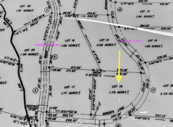 Take Dalewood Road, and then turn right on 2nd entrance (developed road) on Wonder Lane... Lot 18 is located through the rough-in road on your right near corner