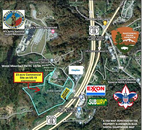 23-ACRE COMMERCIAL SITE ON U.S. 19 Adjoining the US-19 expressway in southern West Virginia, this 23-acre woodland tract with commercial-grade utilities boasts high visibility, high accessibility, and unmatched proximity to principal tourist attractions. More than 19,000 motor vehicles pass daily, including more than 3,000 trucks. Two million tourists visit the region annually, vacationing at the National Scout Reserve and the New River Gorge National Park and Preserve. The property shares utility infrastructure with the U.S. National Guard Armory and includes high-capacity water, sewerage, electric power, and priority road maintenance. Visitation is predicted to grow as the national park economy matures. HIGHLIGHTS & ATTRIBUTES 23-acre tract (+/-) High expressway access High visibility from the expressway Commercial-grade utilities Priority maintained access Proximity to I-77, I-64 Proximity to the National Park Proximity to National Scout Reserve 12 miles south of New River Gorge Bridge LOCATION Google Coordinates: 37.924353, -81.159861 Address: Wood Mountain Road, Glen Jean, WV 25846. (No street address is assigned to properties without structures.) Elevation Range: 1,714 to 1,979 feet above sea level MINERAL RESOURCES The owners deed says that the ownership is SURFACE ONLY. West Virginia is one of the states in the U.S. that has two ownership titles, those being SURFACE RIGHTS and MINERAL RIGHTS. The minerals and mineral rights have been excepted and reserved in the owners deed. BOUNDARIES AND SURVEY The property is being sold by the boundary and not by the acre. UTILITIES Water: W.Va. Water Co. (eight-inch line) Electricity: American Electric Power (three-phase) Natural Gas: Mountaineer Gas Co. Internet: High-speed service available Fire Service: Mount Hope and Oak Hill Fire Department Cell: 5G coverage by several carriers Sewer: White Oak Public Service District ACCESS/FRONTAGE The property is accessed by frontage on Wood Mountain Road (CR 19/36) and an additional strip of access land at the propertys northern boundary. ZONING Fayette County is subject to some zoning and subdivision regulations. All prospective buyers should consult the Fayette County Commission and the Fayette County Health Department for details regarding zoning, building codes, and installation of septic systems. PROPERTY TYPE/USE SUMMARY The property is mostly forestland with some open fields. DEED and TAX INFORMATION Deed Information: A portion of DB 340 Pg. 225 Fayette County, West Virginia Acreage: 23 acres +/- Real Estate Tax ID/Acreage/Taxes: Fayette County (10), West Virginia Plateau District (2) Tax Map 37 Parcel 51; Class 3 2023 Real Estate Taxes: $279.78 DRIVE TIMES Though in a rural area, Glen Jean and the property are located near the center of the eastern U.S. The following mileage and drive time estimates are based on Google calculations. LOCAL DESTINATIONS 0.8 miles to Summit Bechtel Reserve 3 miles to national park boundary 5 minutes to City of Oak Hill 5 minutes to City of Mount Hope 5 minutes to I-77, I-64 10 minutes to Town of Fayetteville 10 minutes to New River Gorge Bridge 15 minutes to City of Beckley 20 minutes to Town of Pax 30 minutes to Summersville Lake 30 minutes to Winterplace Ski Resort 35 minutes to Town of Summersville 50 minutes to City of Hinton 60 minutes to I-79 60 minutes to City of Charleston REGIONAL U.S. DESTINATIONS 50 miles to Charleston, West Virginia 90 miles to Blacksburg, Virginia 100 miles to Huntington, West Virginia 130 miles to Clarksburg, West Virginia 160 miles to Morgantown, West Virginia 170 miles to Winston-Salem, North Carolina 200 miles to Charlottesville, Virginia 215 miles to Columbus, Ohio 215 miles to Charlotte, North Carolina 225 miles to Lexington, Kentucky 225 miles to Knoxville, Tennessee 230 miles to Pittsburgh, Pennsylvania 250 miles to Cincinnati, Ohio 260 miles to Richmond, Virginia 300 miles to Cleveland, Ohio 315 miles to Washington, D.C. 350 miles to Baltimore, Maryland 350 miles to Erie, Pennsylvania 450 miles to Atlanta, Georgia Investment Highlights Valuable land tract The Nation's newest park, The New River Gorge National Park High Traffic Count Great visibility Right at an interchange