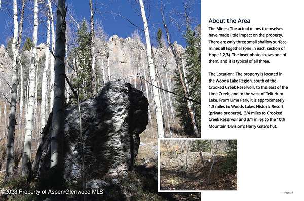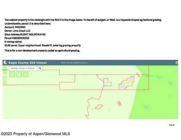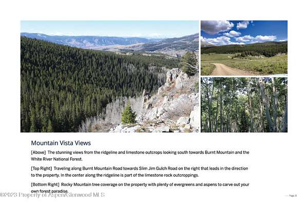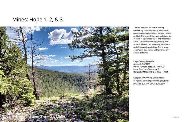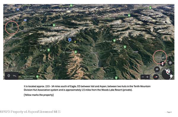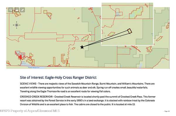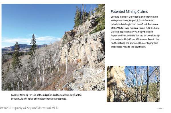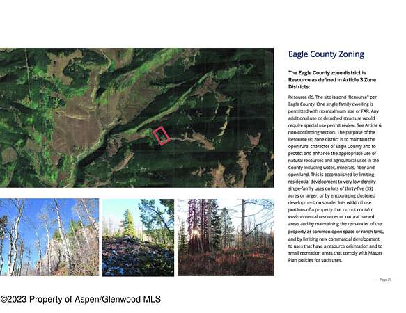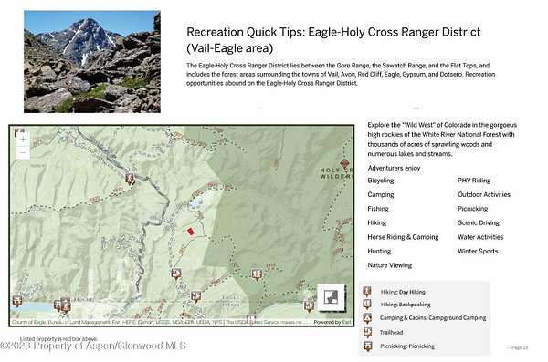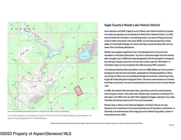 Off the grid living within a Rocky Mountain recreation paradise. Your chance to own a 30 acre in-holding surrounded on all sides by thousands of US Forest Service acres of the White River National Forest and the nearby Holy Cross Wilderness. The property is located approximately halfway between Aspen and Vail, Colorado ski resorts in the Lime Park/Woods Lake Region. It is in the same open park area as two Tenth Mountain Division Hut Association huts, the Harry Gates Hut and the Peter Estin Hut ). Private in-holdings within the US Forest Service lands are rarely available. They are usually long-time family owned and more or less 'secretly' held. In Colorado, this is one of the best, and it is a once in a life-time opportunity. Reasons: The area is prized for its breathtaking open park scenery, spectacular high mountain range views and abundant recreational opportunities. In MLS, see brochure photos (Pgs 4-29) with property descriptions, highlights and maps. Property video link can be found within the photos or here: Oct-Nov 2023: The U.S. Forest Service is planning to conduct a prescribed fire burn for 1-3 days in Oct or Nov in the Lime Park area (Eagle County) this fall if conditions are favorable. Please see Documents Tab for more info.
