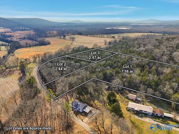 Est $568/moMini Estate opportunity! Three (3) residential lots available approximately 2.44, 2.47, and 7.58 acres. Build-friendly homesites, ideal for custom homes while preserving a natural wooded feel. Enjoy scenic farmland and rolling hill views with the privacy of acreage living. Conveniently located approximately one mile from Highway 72, less than 30 minutes to downtown Huntsville and approximately 30 minutes to Redstone Arsenal (Gate 9). Rare combination of space, scenery, and accessibility. See agent notes for building restrictions and additional details. Invest now, build later!
