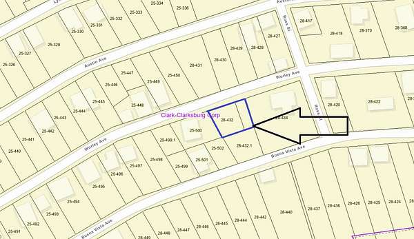 Two adjoining residential lots available in the Alta Vista section of Clarksburg, WV. Totaling approximately 0.14 acres combined, these parcels sit on Buena Vista Ave and Worley Ave, offering public road frontage and development potential. Parcel 1 (Buena Vista Ave): PID: 17-03-0028-0433-0001 Approx. 0.03 acres Appraised at $4,200 Parcel 2 (Worley Ave): PID: 17-03-0028-0432-0000 Approx. 0.11 acres Appraised at $17,100 Sold together or separately. Zoning assumed to be residential - buyer to confirm all building, utility, and permitting details with the City of Clarksburg. No known structures exist on the lots. Great potential for a new build, side yard extension, or investment buy-and-hold. Property sold with QuitClaim deed. Listing agent is licensed salesperson in WV and has ownership interest in the selling entity.
