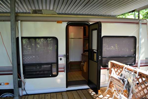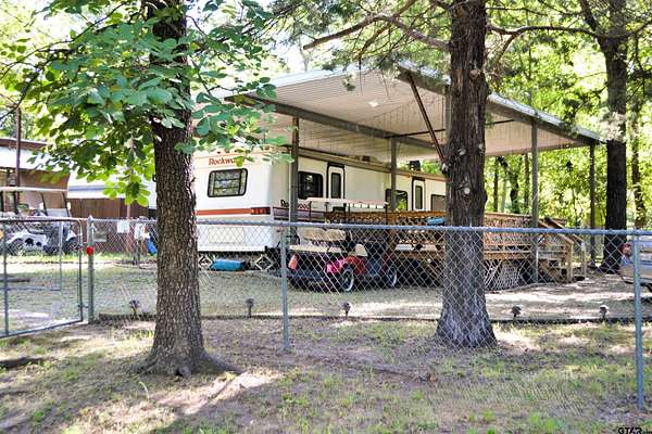 Two fenced lots in Sun Eagle Bay offer the perfect weekend escape or affordable Lake Fork retreat! This property includes a 1991 Rockwood Royale RV that's been protected under a metal awning and features a queen bed, sofa, chair, breakfast table, built-in microwave, and an upgraded full-size refrigerator and freezer. Step outside to enjoy a spacious covered wood deck with a picnic table, ceiling fan, and plenty of shade from tall, manicured trees. The two lots are fully enclosed with chain link fencing for privacy and security. A storage shed and outdoor grill add functionality for extended stays or gatherings. Sun Eagle Bay amenities include a boat ramp, fishing pier, swimming pool, clubhouse, and playground. Enjoy direct access to Lake Fork--just named the #3 bass fishing lake in the nation by Bassmaster. Whether you're looking to unwind, fish, or entertain, this property is ready to go!