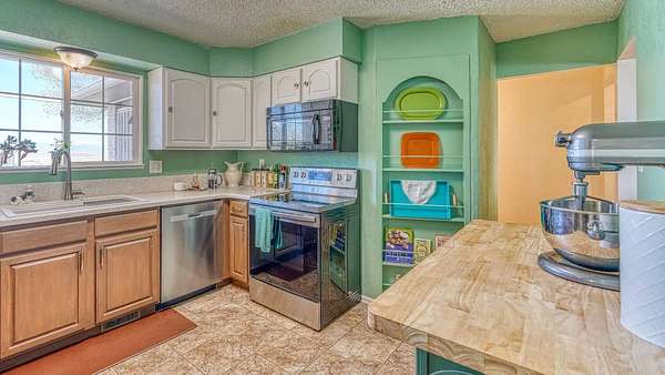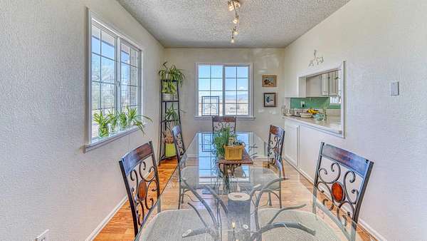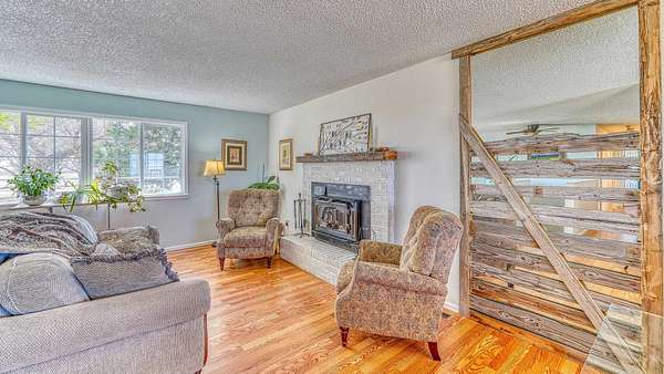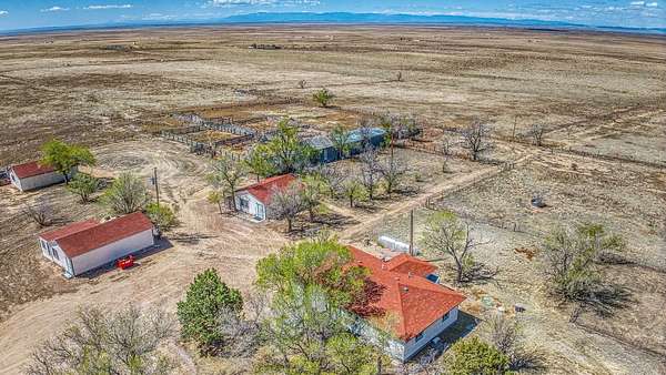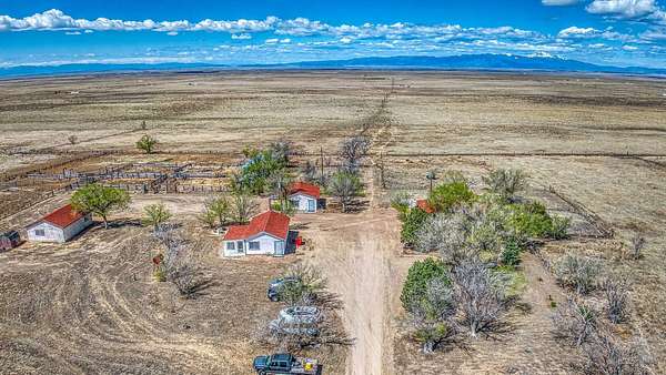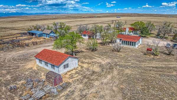 Continuing up the lane, the primary residence and a guest house perch atop, offering unobstructed views stretching from Pikes Peak to the Sangre de Cristo Mountains and the Spanish Peaks. The main ranch house embodies the rustic charm of a traditional western home, boasting four bedrooms and two bathrooms. Inside, a welcoming living area with a brick fireplace and expansive windows framing majestic sunsets invite relaxation. The park-like surroundings of the main house foster a serene ambiance, ideal for communing with nature.