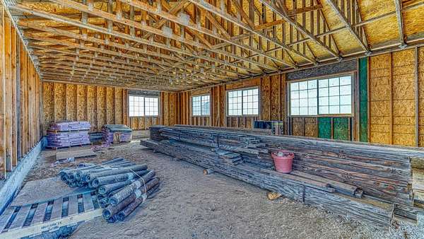 As you journey through the guarded entrance, a vast expanse of sky and sweeping mountain vistas welcome you to Wing Shadow Ranch, where the original working facilities stand as the heart of this idyllic property. Among these facilities are the barn, corrals, a loading chute, two loafing sheds, and the historic grainery. Additionally, a garage for equipment and a workshop adjoined to the greenhouse provide practical amenities.