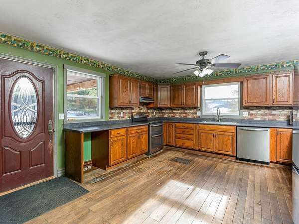 Large kitchen with oak cabinets and plenty of countertop space