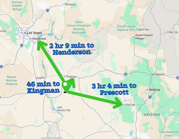 Located with convenient access to I-40, the properties provide proximity to Kingman, Yucca, and Lake Havasu City for boating and year-round recreation. Las Vegas and Henderson offer major services and entertainment within reasonable driving distance while maintaining rural desert living. The surrounding area includes established residences and RV setups with friendly local residents.