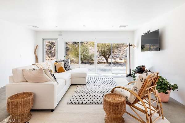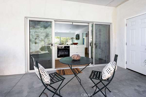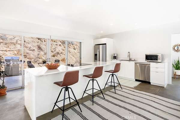 Stepping back outside, you find the perfect spot to host barbecues and get-togethers or simply relax at the end of the day while taking in the phenomenal views. Enjoy bright blue skies above the vast valley during the day, and at night, watch the city lights twinkle against the backdrop of the Joshua Tree National Park. Bordering the property are 25 acres of protected UC and BLM land, allowing you to hike right from your front door into the untouched desert.