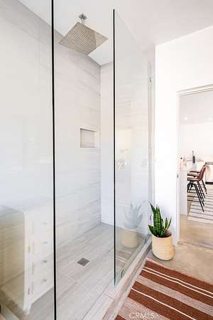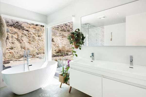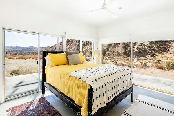 The primary suite boasts gorgeous views of Yucca Valley, thanks to large, well-placed windows that maximize the stunning scenery. Enjoy direct access to the south patio through large sliding glass doors, showcasing indoor-outdoor living at its finest. The spacious primary bathroom features a gorgeous walk-in shower with dual rain showerheads, a modern vanity with dual sinks, and a soaking tub positioned to take advantage of the view!