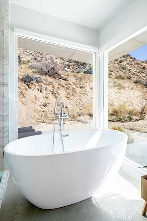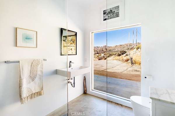The guest bedroom and bath offer even more exquisite panoramic views of the majestic Sawtooth Mountains, above Pioneertown.