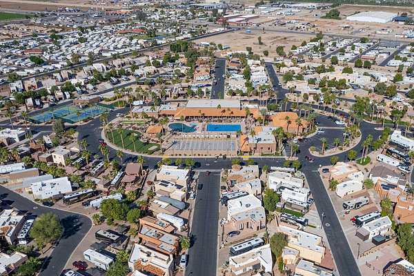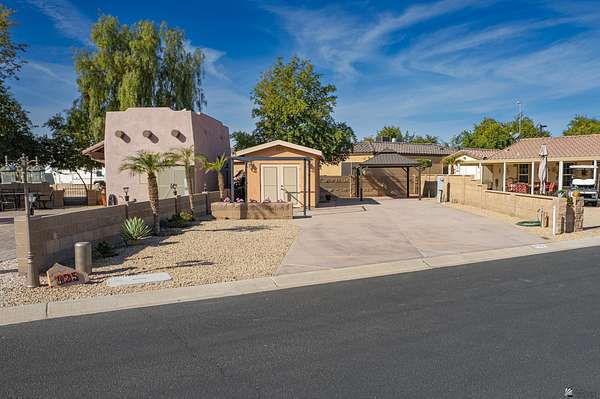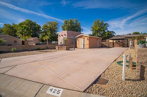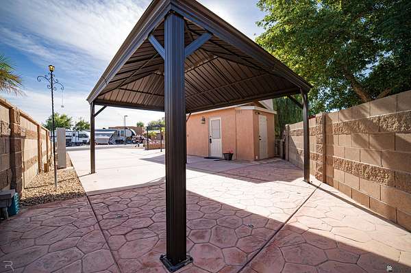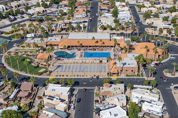Lot 425 at the Palms RV Resort offers the perfect blend of comfort, convenience, and resort-style living in the Arizona desert. This spacious lot accommodates large RVs, travel trailers, or 5th wheels and includes a well-appointed support building featuring a washer and dryer, sink, half bath, refrigerator, and flexible space ideal for a Murphy bed, couch, or hosting small gatherings such as game nights. The Palms RV Resort provides an unmatched lifestyle with amenities including two pools, relaxing spas, a ballroom, library, billiards and poker rooms, shuffleboard, tennis courts, and two dog parks. Whether you're seeking a seasonal retreat or a full-time residence, this property delivers the luxury RV lifestyle that allows you to live your best desert life during the winter months.