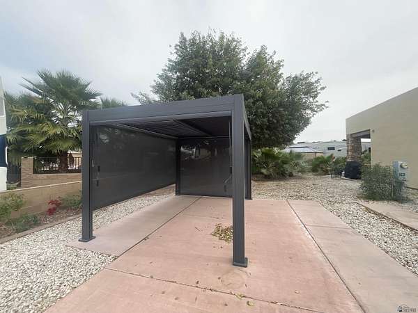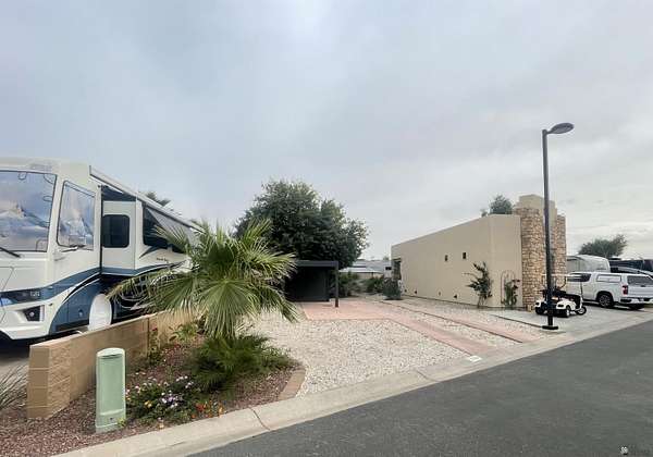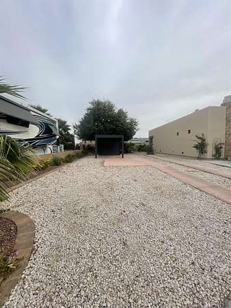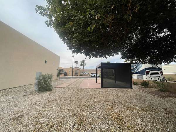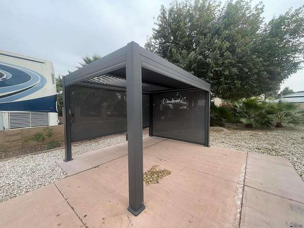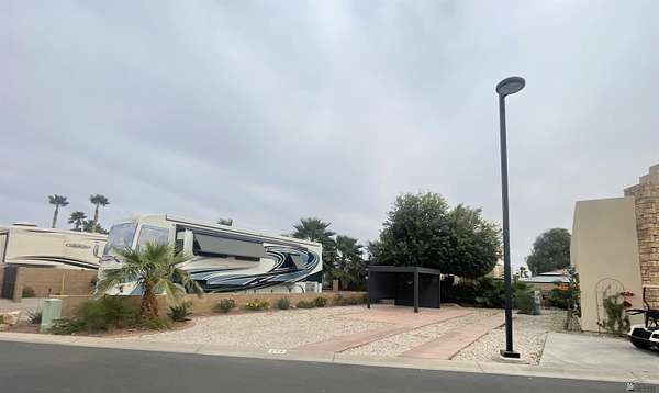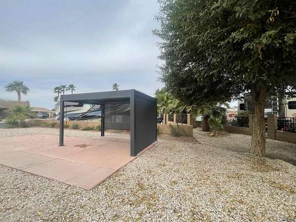 Est $613/moMove-on ready west facing RV site with full hook-ups. Perfect location to park your RV with just the right amount of sun & shade. Brand new modern style solar powered pergola with automated shades, interior lighting & adjustable water proof louvered ceiling. Professional drip irrigation recently installed with several flowers & shrubs ready to show off their vibrant colors during "Snowbird" months! Lot is a short distance to center of resort where the clubhouse area is located offering numerous onsite amenities along with seasonal planned events, classes, concerts & cafe/bar. Located in Yuma's 55+ gated boutique resort; pet friendly, too!