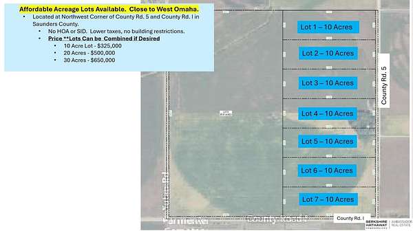 Est $2,635/moTroy Benes, M: 402-658-6522, troy.benes@bhhsamb.com, https://www.bhhsamb.com/troy.benes - Enjoy the peace of country living approximately just 5 minutes from Omaha on these scenic 10-acre lots. With room to build your dream home, shop, or garden, you'll have space to spread out while staying close to city amenities. Located less than 1/4 mile off paved roads, these properties offer a perfect mix of privacy and convenience. Zoned Residential Estates with no HOA or builder attachment, you're free to build how and when you choose. An Acreage like this in such a prime location is hard to find so don't miss your chance to create the lifestyle you've been dreaming of!